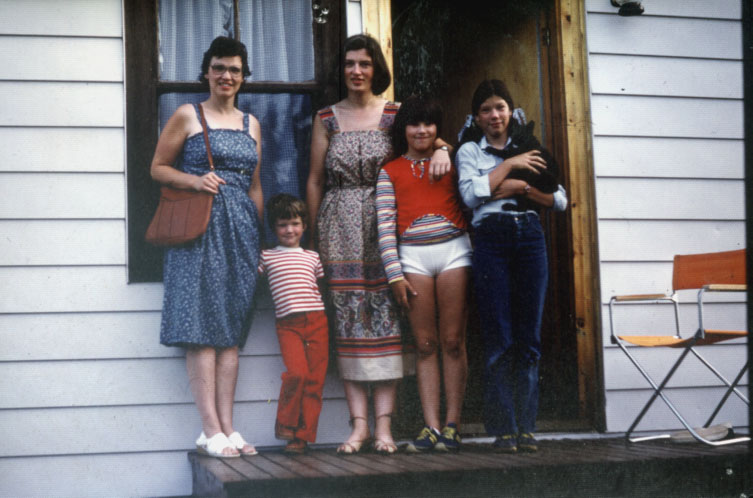 • This is the door to this same house, in 1979, before I painted it red, and about a year after I bought the house. My brother-in-law Arnold took this photo of me with my sister June and her three children, Angie, Margie, and John. They drove all the way from Petawawa, Ontario and walked through my door at a time in my life when I needed some loving kindness. I was alone in this then ramshackle house; my short-lived marriage had just broken up; I was less than a year into a complex and highly responsible management job at StFX, having taken on the role of Manager of Residences and Food Services, the only woman on an all-male management team. June walked through the door and knew instinctively how to cheer me up. A new outfit!! June has all the sewing genes in our family. We chose fabric and she made the dress I am wearing, as I recall, without a pattern. I had a sewing machine that our mother gave me as a graduation present for my B.A. from Queens, in hope that I too would learn to sew. Didn’t happen. And oh yes, June made blue gingham curtains for my most of the exposed windows in my new home. The only curtain that I had come up with on my own was in the form of a a very large nightie trimmed with Battenburg lace, which belonged to one of my ample aunts on my mother’s side. That dress I am wearing in the doorway, I wore for years, until it was just too faded. But the memory and my gratitude for my family walking through that door, is still fresh. BTB, those three beautiful children on the doorstep are now grown up with children of their own.
