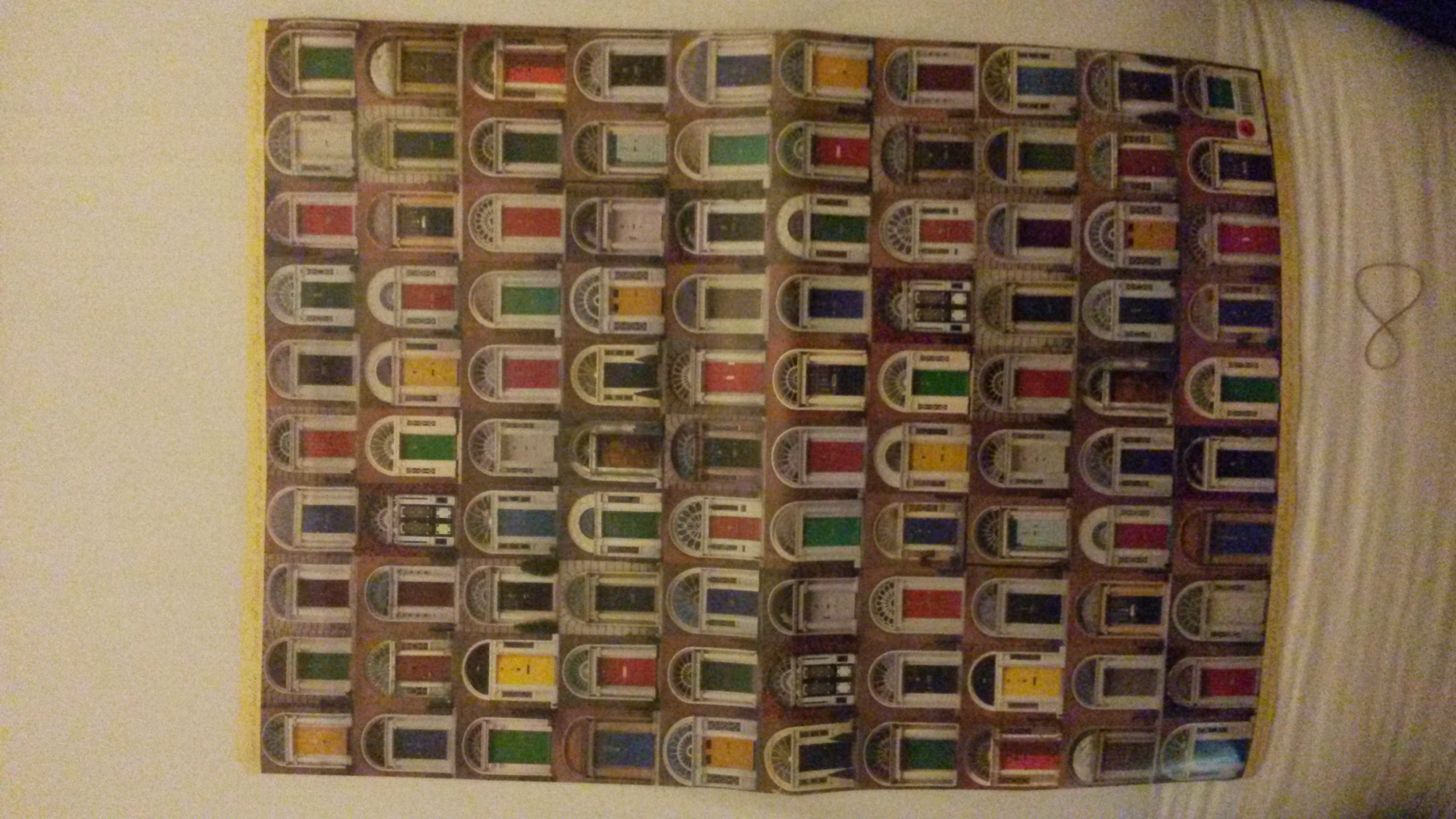 • We took note of the Georgian doors throughout Dublin, Ireland when we visited there in February, 2015. Tour operators and walking guides point out these doors to tourists. They feature on souvenirs such as fridge magnets and wrapping paper. Here is a photo of the wrapping paper. The proprietor who sold us the paper made the wry comment that the doors were painted in so many different colours so that men could find the right door after a long night at the pub.