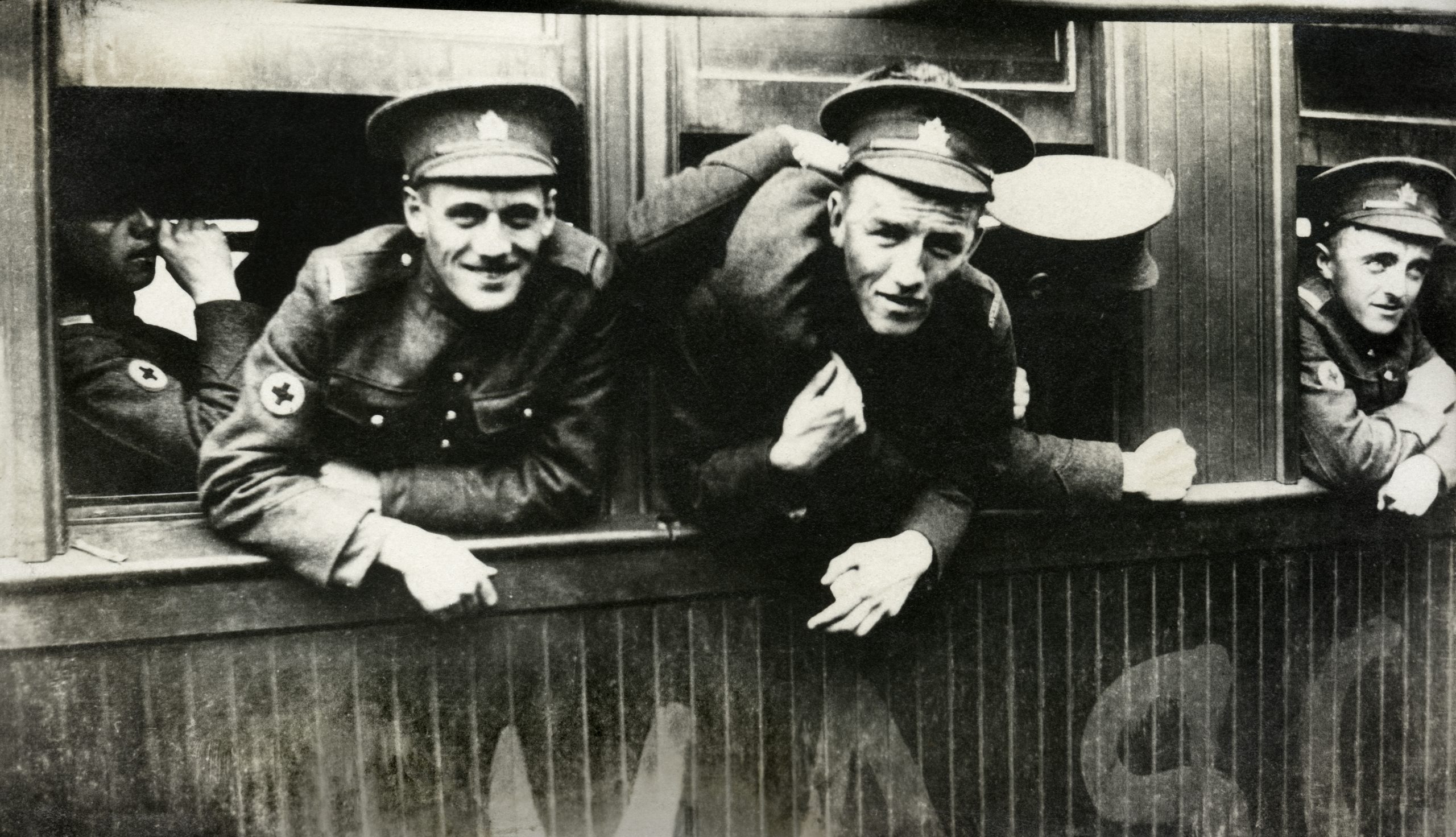 L-R: Eddie MacDonald, Cleve and “Amby” Sloane, final farewells as the train pulls out of the Antigonish station, 1916. Photo Courtesy of Antigonish Heritage Museum. Restoration: Anne Louise MacDonald.